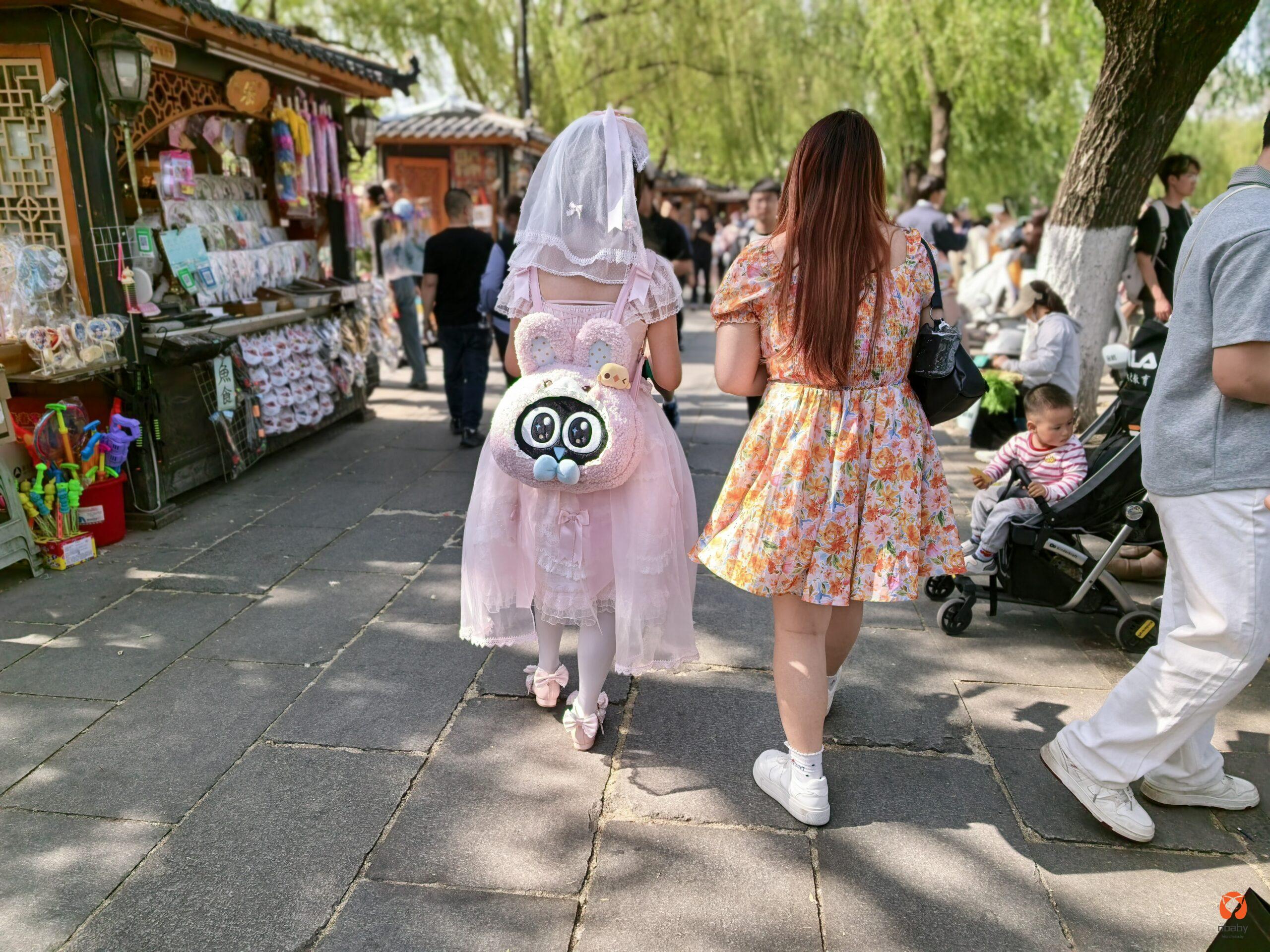 这可能只是个普通的周末吧,路上的游人络绎不绝。当然,也有无数穿汉服的小姐姐,只是妆画的稍微浓了点,没那么精致。不过户外拍照可能也好,毕竟室外的光线和环境还是蛮不错的。当然,不精致的好处就是化妆时间可以大大减少,这样就可以多画几个了。