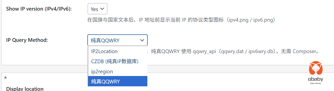 ### v16.06.99 - 版本号更新至 16.06.99 - 新增 **纯真QQWRY** IP 查询方式(qqwry_api:qqwry.dat / ipv6wry.db),无需 Composer - 新增 **显示协议类型** 选项:在国旗与国家文本后、IP 地址前显示 IPv4/IPv6 图标(img/ipv4.png、ipv6.png) - QQWRY(IPv4/IpLocation、IPv6/ipdbv6)与 ip2region(xdb)返回完整字段,支持国旗与完整归属地显示 - 图标样式统一:IP 版本图标与 IP 地址图标使用与浏览器/系统图标相同的 vertical-align 等样式