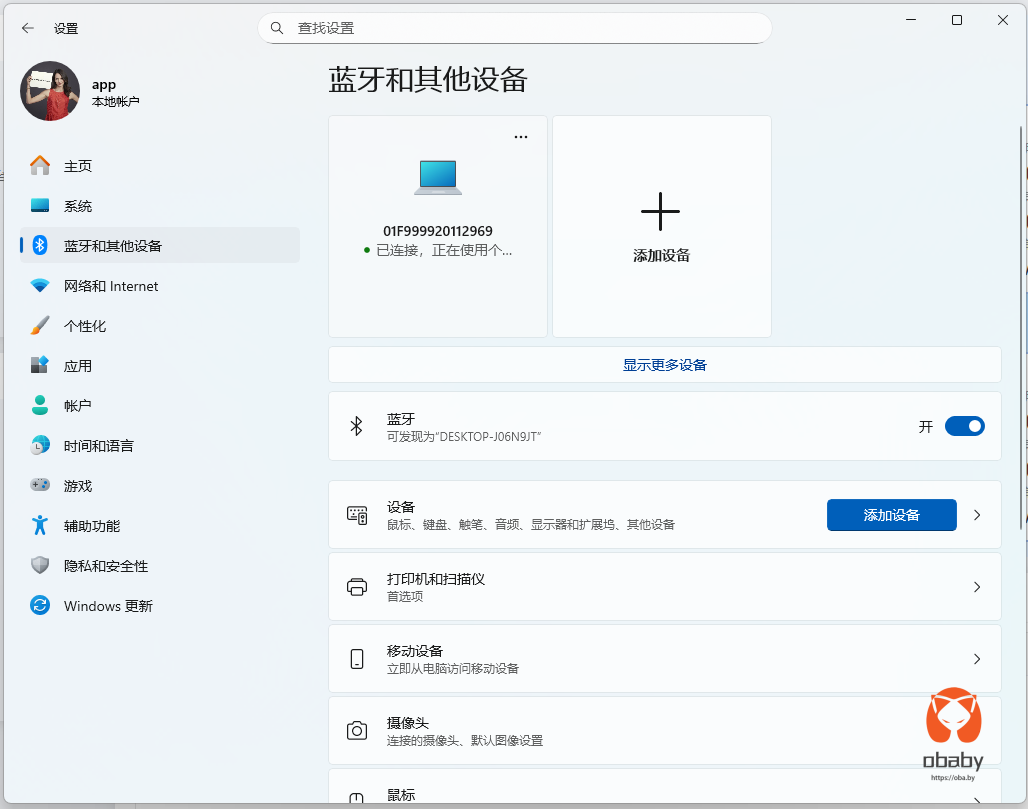 8. 连接状态显示在热点设备名称下的 “其他设备 ”中。 若要断开与蓝牙个人区域网络的连接,请遵循相同的步骤连接到热点设备,但选择“ 断开 PAN 连接 ”按钮,而不是“ 连接 ”按钮。